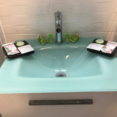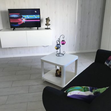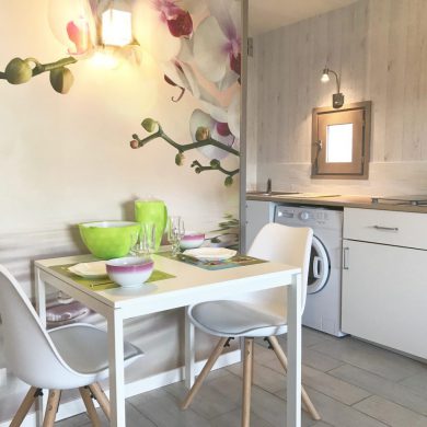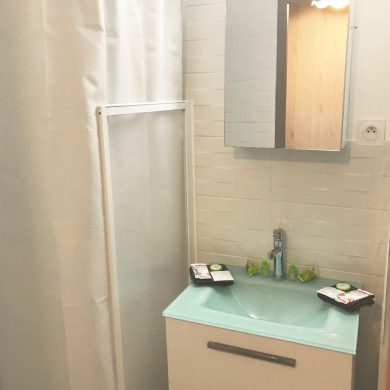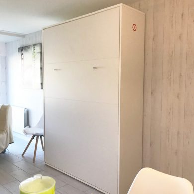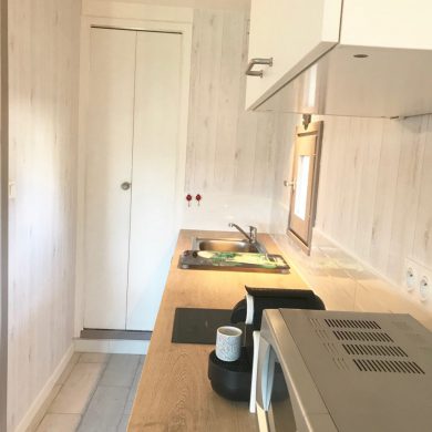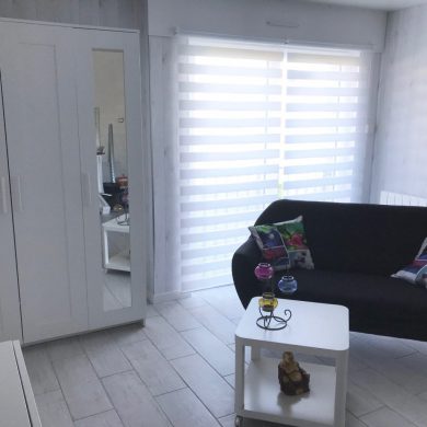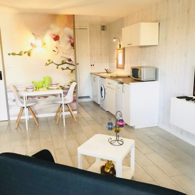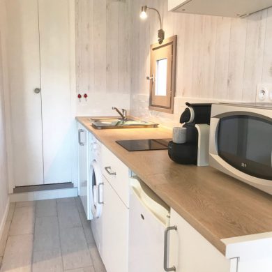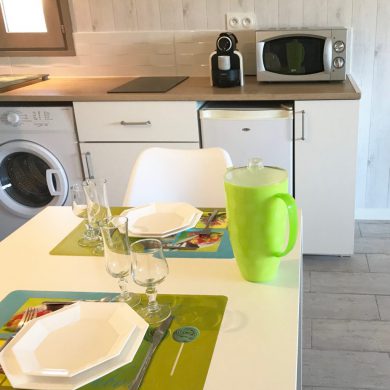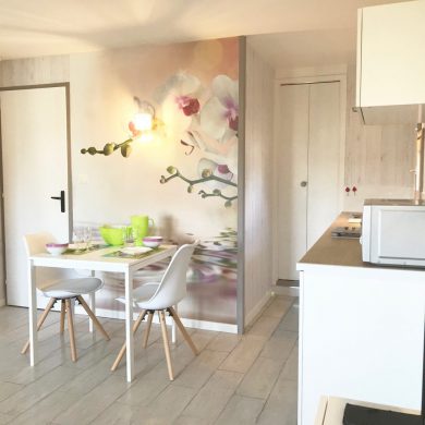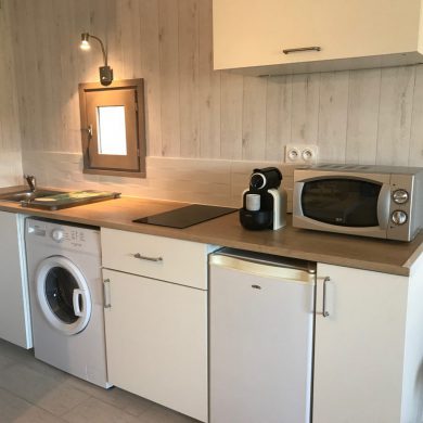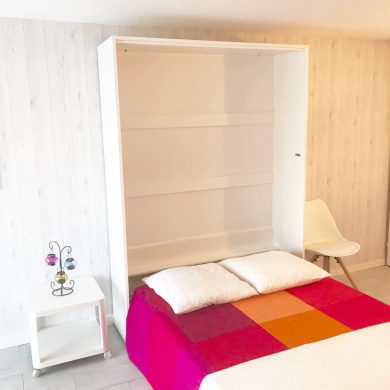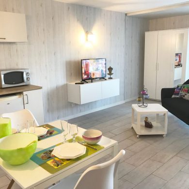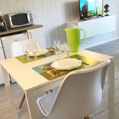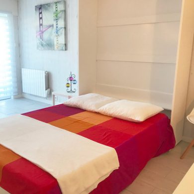 Studio comprenant: coin cuisine (four micro-ondes, réfrigérateur, plaque de cuisson induction, grille pain, vaisselle et couverts, casseroles, poêles, ustensiles de cuisine…), WC, salle de bain, salon avec téléviseur écran plat, lecteur DVD, couchage en lit armoire 140 x 190 (matelas hôtelier), vue mer côté droit de la location.